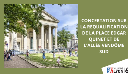 Dans le cadre de la concertation (du 4 septembre au 4 octobre) sur la Requalification de la place Edgar Quinet et de l'allée Vendôme Sud, Pascal BLACHE, Maire du 6e arrondissement de Lyon et Laurence CROIZIER, Conseillère d'arrondissement déléguée au Cadre de vie et à l'Urbanisme vous invitent à assister à une réunion publique en présence des élus de la Métropole de Lyon et de la Ville de Lyon :