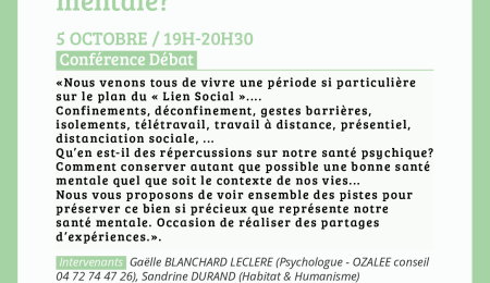 Santé 23 septembre 2021 Lien Social : quelles répercussions sur notre santé mentale? Conférence Débat dans le cadre de la semaines d'infirmation sur la santé mentale Lien social 5 octobre 19h20h30 HD.pdf A lire aussi Article précédent Article suivant Santé Publié le : 6 octobre 2025 Punaises de lit : ouverture de la Maison Oh Punaises Sensibiliser pour s'en débarrasser. Santé Publié le : 3 octobre 2025 Où donner son sang cet automne ? Depuis septembre, donner votre sang en toute simplicité grâce à de nouvelles conditions d'éligibilité ! Santé Publié le : 25 septembre 2025 Octobre Rose Chaque année, Octobre rose sensibilise au dépistage du cancer du sein et à récolter des fonds pour la recherche. Santé Publié le : 10 septembre 2025 Le Centre international de Recherche sur le Cancer a 60 ans Plongez au coeur de la recherche ! Santé Publié le : 1 septembre 2025 Agir contre l'obésité avec "Fort en sport" L'association lyonnaise propose un programme collectif unique, pensé pour accompagner les personnes en situation d’obésité dans un cadre bienveillant. Santé Publié le : 26 août 2025 Dépistage : prendre soin de votre coeur L'Hôpital Saint Joseph Saint Luc participe à une journée de sensibilisation et de dépistage en partenariat avec la Fédération de Cardiologie de Lyon. Santé Publié le : 9 août 2025 Pollution à l'ozone : information et recommandations La Préfecture active le niveau information-recommandation pour pollution de l'air à l'Ozone Santé Publié le : 7 août 2025 Que faire en cas de vigilance canicule rouge ? Découvrez les bons gestes et les actions menées par la Ville de Lyon en période de vigilance canicule rouge. Santé Publié le : 7 août 2025 Que faire en cas de vigilance canicule orange ? Découvrez les bons gestes à adopter et les actions menées par la Ville de Lyon en période de vigilance canicule orange.