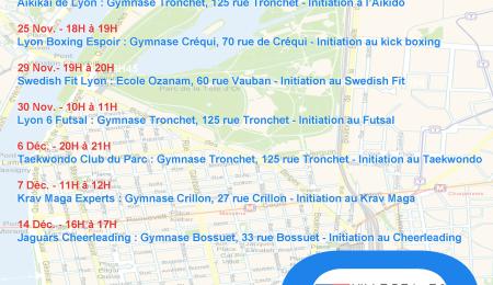 Sport 13 novembre 2019 Sport Ensemble - Édition 2019 Venez nombreux à la découverte de nouvelles disciplines ! planning.pdf Planning A lire aussi Article précédent Article suivant Sport Publié le : 16 septembre 2025 Réouverture de la piscine de Vaise Après d'importants travaux, venez (re)découvrir la piscine de Vaise ! Sport Publié le : 22 août 2025 Marche Nordique et BungyPump Marchez, c’est bon pour la santé, et avec des bâtons c’est encore mieux ! Sport Publié le : 31 juillet 2025 Des activités gratuites pour garder la forme ! Inscrivez-vous à nos rendez-vous encadrés par des coachs professionnels et découvrez des parcours en plein air, dans toute la ville. Sport Publié le : 7 juillet 2025 Oasis Lyon 8 : de nombreuses activités sportives gratuites ! Le dispositif Métropole vacances sportives (Oasis Lyon 8) animé par les clubs et associations du territoire est de retour cet été !!! Sport Publié le : 7 juillet 2025 Jérémy Stravius : un ambassadeur en or Ancien athlète, Jérémy Stravius est ambassadeur des EuroGames, événement européen du sport inclusif qui se déroule à Lyon du 23 au 26 juillet ! Sport Publié le : 1 juillet 2025 Run In Lyon : quelques conseils pour se préparer ! De nombreux sites spécialisés fournissent des plans d'entraînement. Sport Publié le : 16 juin 2025 Dates d'ouverture des piscines en mode été Depuis le 7 juin, les piscines municipales de Lyon passent en mode “été” ! Sport Publié le : 20 mai 2025 Un mur interactif pour la Maison Sport santé de Gerland Grâce à ce mur interactif, les participants arrivent à combiner leur passion pour les jeux interactifs avec l’activité physique ! Sport Publié le : 19 mai 2025 Alice Milliat à l'honneur Une plaque est dévoilée dans le gymnase qui porte le nom de cette militante des droits des femmes et du droit à l’éducation physique.
