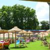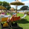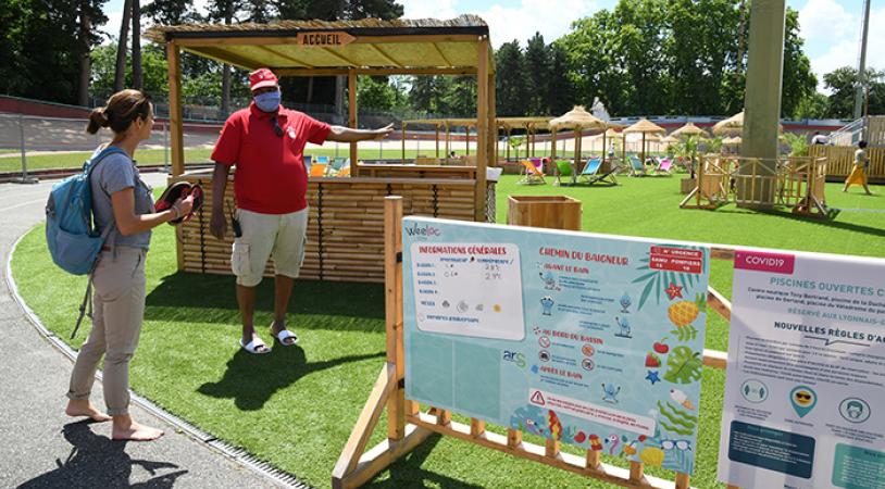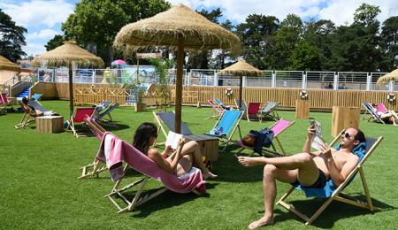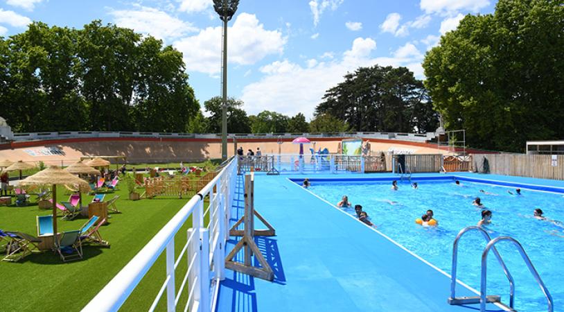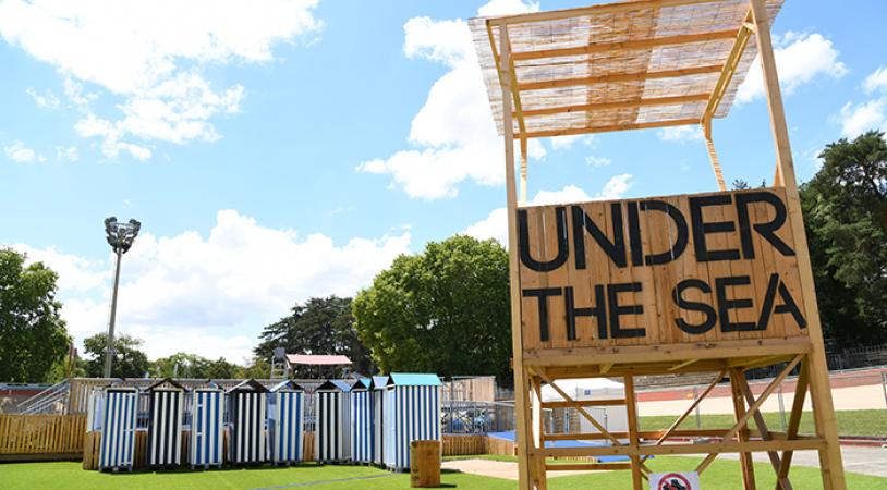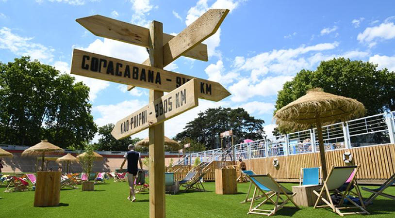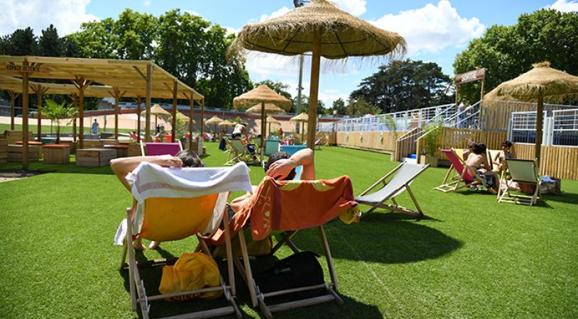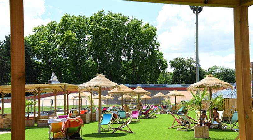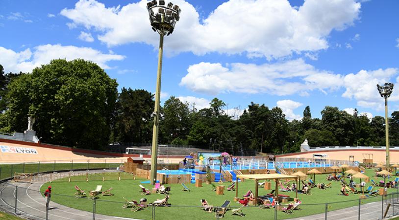 On s’y croirait. En huit jours, le vélodrome du parc de la Tête d’Or s’est transformé en plage de bord de mer, le sable en moins (pour des raisons techniques). Entre paillotes et cabines rayées, on peut s’imaginer, au choix, sur une plage du sud ou sur une plage du nord. Ici, on bronze, on lit, on discute, on se pose… Quand il commence à faire chaud, une douche, un passage dans le pédiluve et hop, à l’eau !