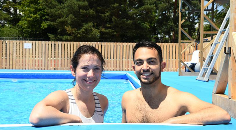 Deux bassins sont à disposition, le plus grand propose 200 m2 de baignade pour 1 mètre de profondeur, le plus petit 100 m2 pour 60 centimètres. L’eau est-elle bonne ? « Oui », répondent en chœur, Camille et Hady, « c’est la première fois qu’on vient, c’est très agréable, très tranquille. Et la jauge est parfaite pour en profiter. » Consignes sanitaires obligent liées au coronavirus, 80 personnes au maximum sont autorisées à s’y plonger. Couples, ami.e.s, familles sont venus découvrir le concept imaginé par Weeloc, une entreprise lilloise. « On habite en ville et on adore le parc. Je ne connaissais pas le vélodrome, c’est vraiment très chouette d’être dans ce cadre. Même sur le plan esthétique avec ce mélange entre la piscine, les arbres, l’architecture du vélodrome », assure Julie, accompagnée de Matthieu et leur petite fille de 18 mois, June. La fillette pourra aussi profiter pleinement d’une plateforme de jeux d’eau prévue pour les enfants.
