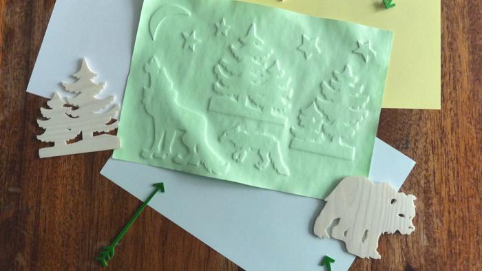 Venez découvrir l'embossage à froid, ce procédé simple et très rapide, quelques minutes suffisent pour imprimer l'un des visuels proposés sur du papier coloré.
