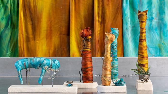Elle s’est plongée dans l’histoire de l’Égypte ancienne et plus particulièrement du sanctuaire Bubastis dédié à la déesse chat Bastet, où de nombreuses sculptures de chats et des chats momifiés ont été retrouvés. Elle a, pour ce projet, étudié toutes les étapes de la momification d’animaux pour se concentrer sur les tissus et les méthodes d’enveloppement.