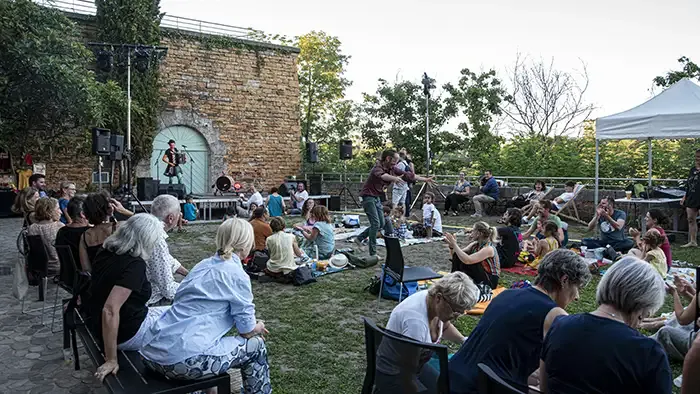Soirée estivale et festive sur la terrasse du Fort de Vaise, entre ami(e)s ou en famille, explorant l'univers fascinant de l'art de la rue.
