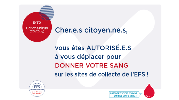 L’EFS doit poursuivre la collecte de sang car les produits sanguins ont une durée de vie limitée : 7 jours pour les plaquettes et 42 jours pour les globules rouges. Son objectif : continuer à transfuser tous les patients qui en ont besoin ! C’est capital et vital.