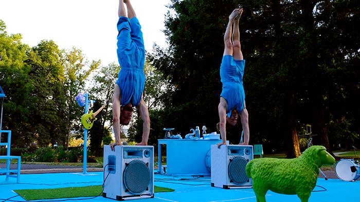 Un bleu qui n’a parfois ni queue ni tête, parfois une tête et pas d’oreilles, et souvent deux têtes et quatre jambes. Une étrangère arrive, un peu perdue. Ils l’accueillent. C’est l’histoire de trois destins qui tentent de communiquer. Un univers décalé où l’esthétique revêt bien des formes et où le sens a bien des directions. Une plongée cocasse dans un univers absurde. Bleu.