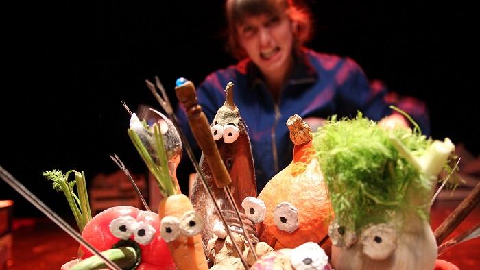 Sur scène, deux comédiennes-chanteuses forment un duo clownesque. Elles interrogent petits et grands sur le contenu de leur assiette et racontent cette histoire de légumes citoyens avec autour d’elles, de vrais légumes, et de vrais instruments de musique.