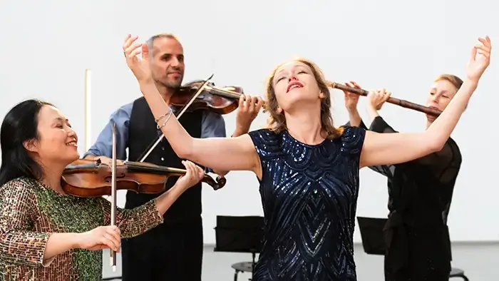Au centre d’un dispositif circulaire, 10 artistes évoluent, jouent, chantent, dansent, oscillants entre légèreté et profondeur, retraçant ainsi la vie remplie de succès et de tourments de celui qu’on surnomma le Musicien des Grâces.